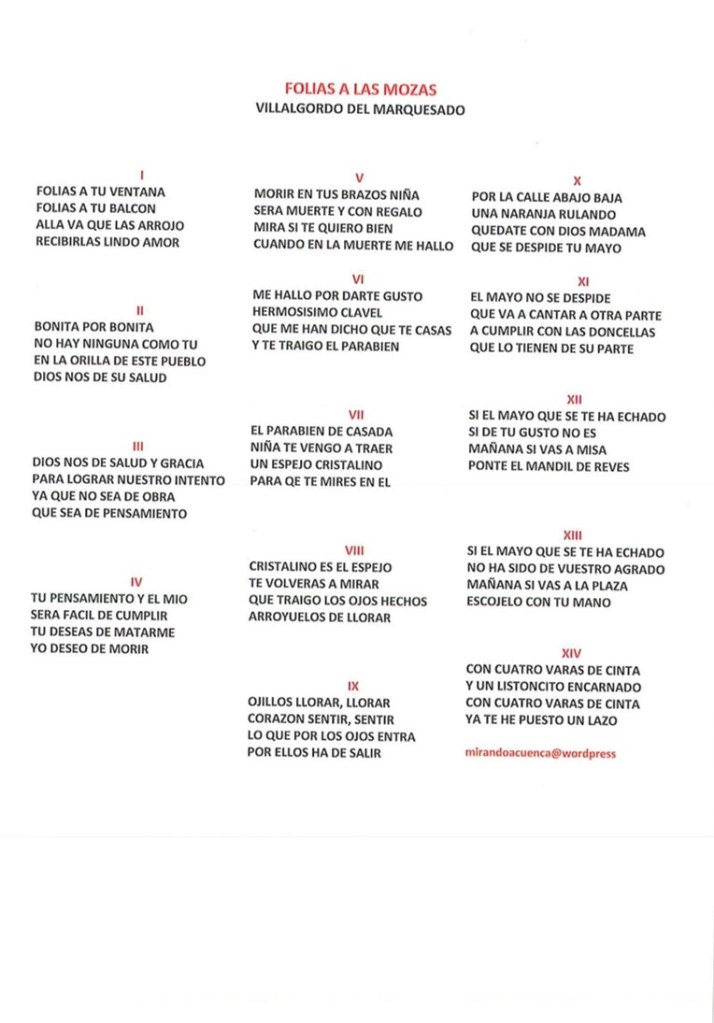 En un documento de 1896 de Emilio Pinedo Moreno aparecen transcrito, además de las Folias y Mayo a la Virgen, las Folias y Mayo a las Mozas. Lo que acredita que hubo un tiempo en que se cantaban estos mayos, hoy en desuso.