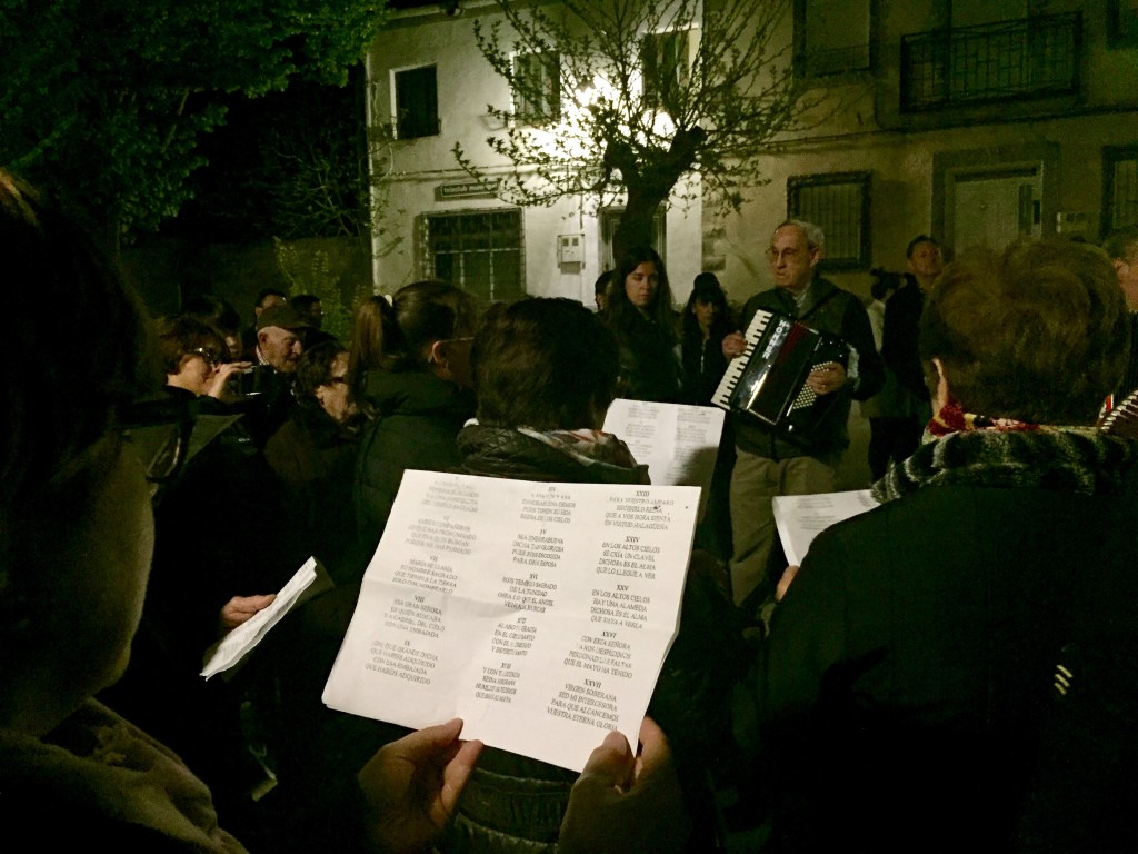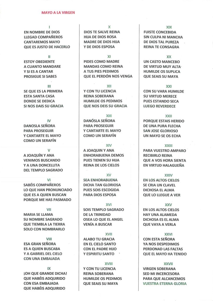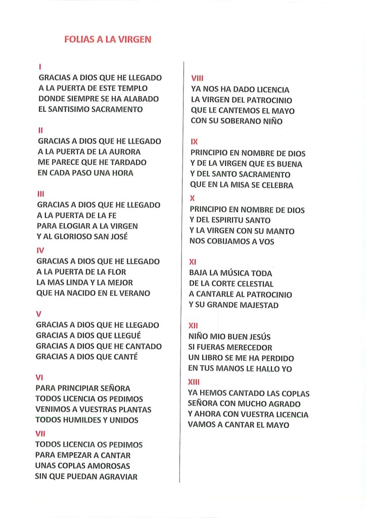El canto del mayo es precedido por las Folias a la Virgen en las que se solicita permiso para, acto seguido, cantar el mayo.