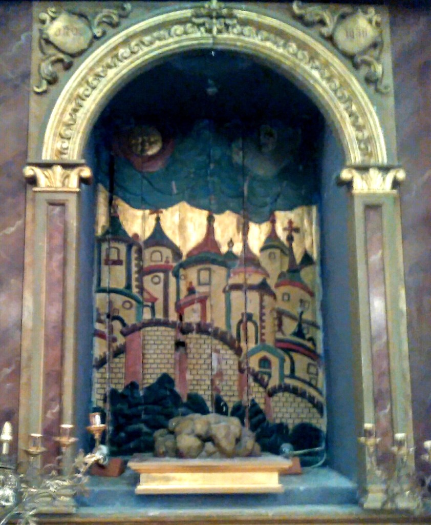 En el lateral derecho de la iglesia, y al fondo de una hornacina, se encuentra una tabla que representa, el Jerusalén Celeste. Se trata de un bajorrelieve realizado con la técnica del estuco y policromado. Por su antigüedad se puede afirmar que procede de la antigua iglesia románica. Comparado con otras similares se puede deducir que estuviera ubicada en el antiguo retablo de la “iglesia vieja”.