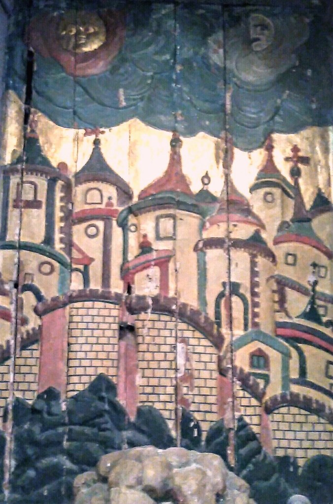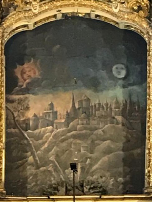 Representa una ciudad amurallada, bastante estilizada y de rasgos orientales, sobre ésta las imágenes del sol y la luna con rasgos humanos destacan en un cielo muy oscurecido. Sirve como fondo a la ubicación del Cristo de la Vera Cruz.