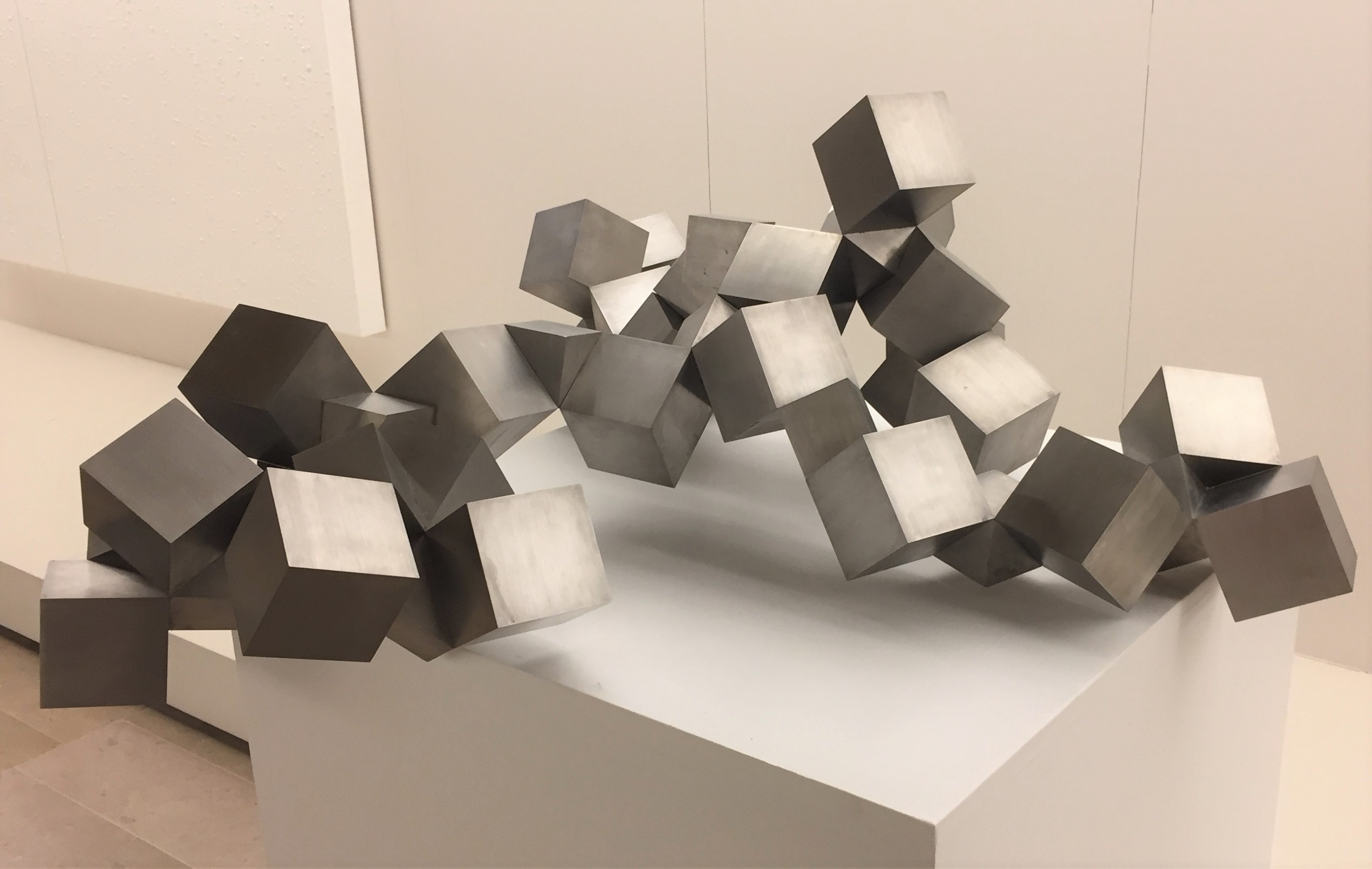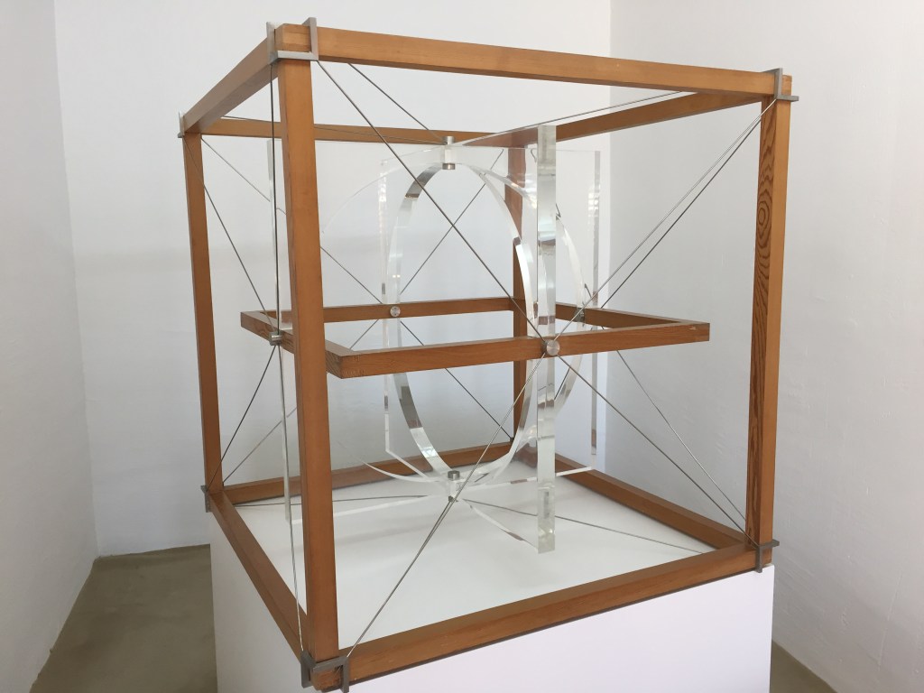 Escultura escueta y compleja, geométrica y que a la vez contiene en su seno elementos no reducibles a términos racionales. Una construcción que “sugiere” más de lo que “dice”, más de lo que son en sí mismas las escuetas piezas –una inmaterial esfera de metacrilato inscrita en un cubo de madera de cedro- que la componen. (BONET y MADERUELO, 2005)