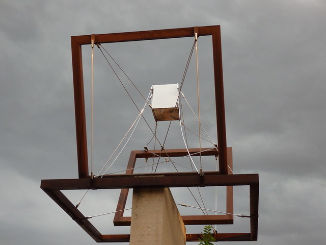 Se trata de una estructura unitaria a la vez que uniplural mantenida en equilibrio por fuerzas contradictorias que son las que hacen que se conserve en unidad, apoyado todo en una base –que no es elemento diferenciado sino parte misma de la escultura- de gran firmeza que sería el terreno, un terreno que asciende y con ello ya no es simplemente un elemento geológico o biológico, sino también racional. Sobre esa base se ubica el cerco inferior, el único en el que se enganchan todas las demás cosas, que sería el pueblo… Y el cubo central (de chapa de acero inoxidable sobre un interior de conglomerado) está pensado como símbolo o representación del poder que a la vez que es unitario, lo centra todo y brilla; es decir, además de mandar, preside (TORNER)