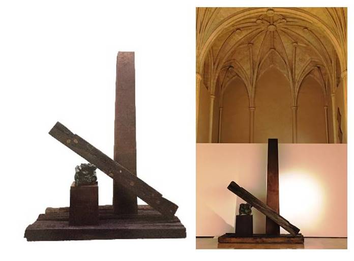 Se trata de una obra muy profunda y clara conceptualmente donde aparece el monumento “ininterrumpido” truncado, el tronco de madera corruptible no termina de caer al estar sustentado por ese monumento “non finito” al que a su vez impide crecer y realizarse, que todo sigue fluyendo pese a las ansias de permanencia del obelisco de acero incorruptible. (FRAILE, 2016)