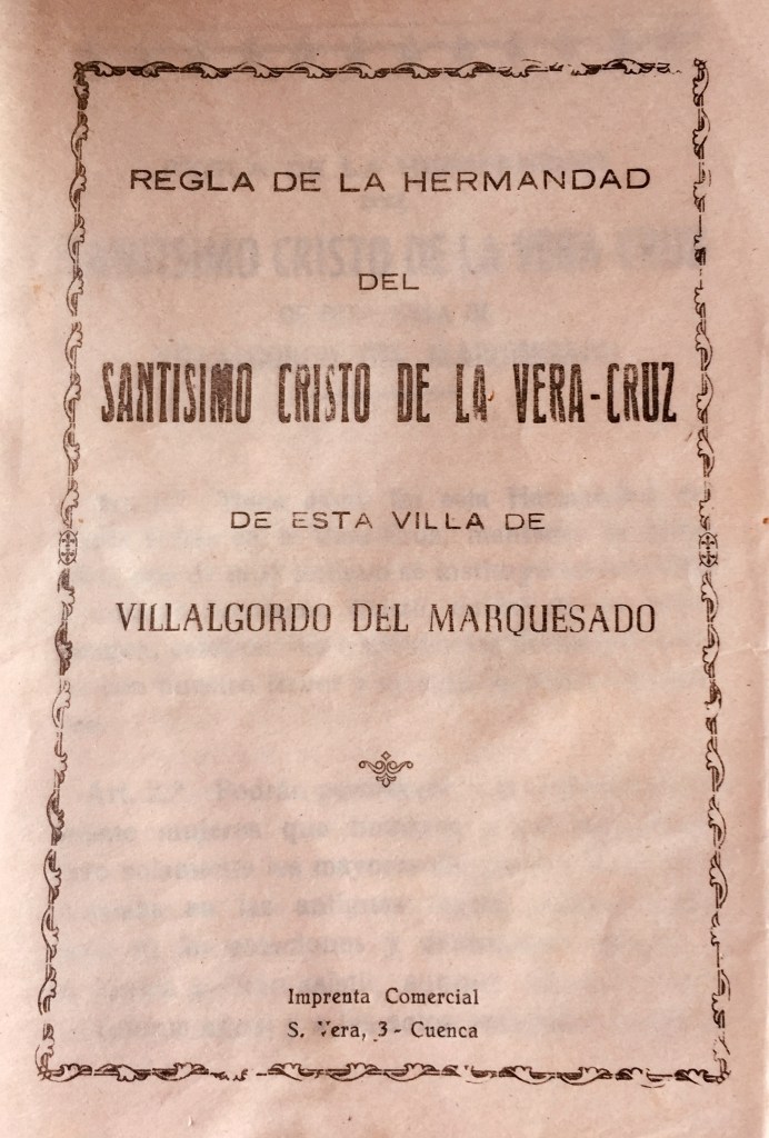 La Hermandad ya existía en el año 1795, tenemos prueba de ello a través de un registro del archivo parroquial fechado el 6 de mayo en el que se reflejan las cuentas de ese año (78 reales de ingreso y 78 de gasto). Allí también se encuentra el “Libro de la Santa Vera Cruz de la iglesia Parroquial de Villalgordo del Marquesado. Año de 1806”, en el que consta la Regla de la Hermandad de la Santa Vera Cruz, articulada en 39 capítulos, expresándose al final de la misma que fueron “copiadas literalmente de las antiguas que aparecen en el libro anterior de la Santa Vera Cruz”.