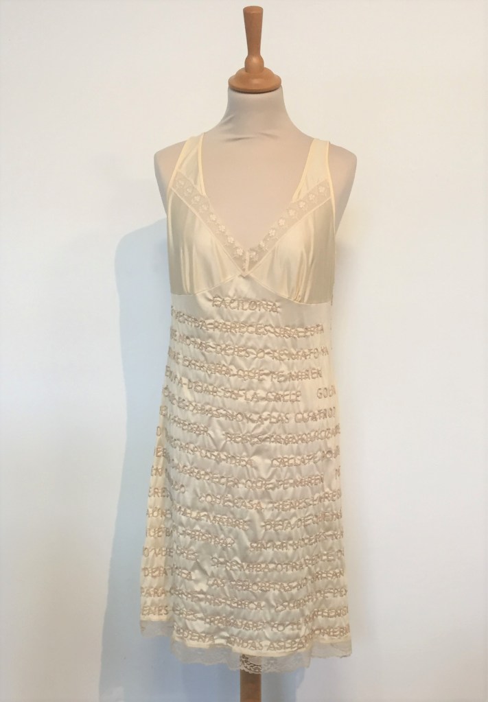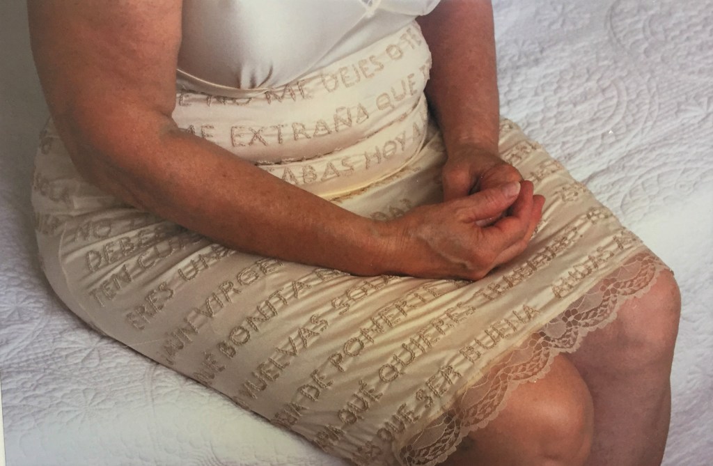 La pieza visibiliza casos escogidos de violencia verbal a partir del bordado de frases en una combinación, prenda que tradicionalmente ha sido como la segunda piel de una mujer, «la obra pretende abordar lo que se oculta y se lleva puesto metafóricamente, volviéndose una marca exterior casi imperceptible a la vista pero que se manifiesta de manera cruda y real en la intimidad de la casa y con el paso del tiempo»