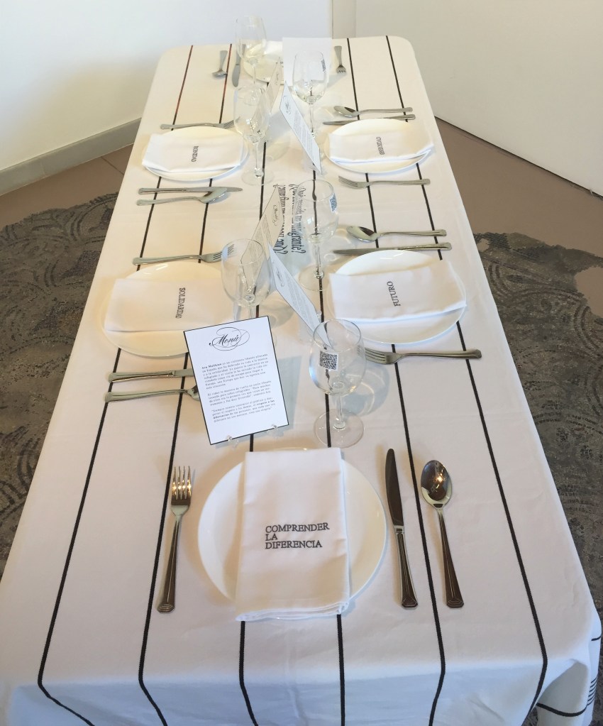 A través de la inclusión de texto y vídeo en formato QR. Propone un escenario interactivo donde es posible sentarse a la mesa con comensales y conversar simbólicamente con sus historias.