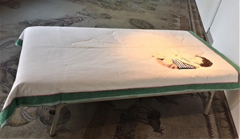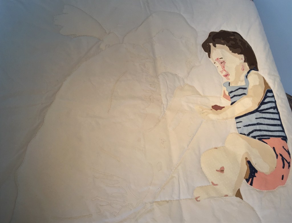 Colcha hecha en patchwork. Reflexión ante las criaturas huérfanas de madre por violencia de género. Composición de dos siluetas entrelazadas, en la distancia se distingue una madre que se desvanece en el blanco de la tela en contraste a los del niño.