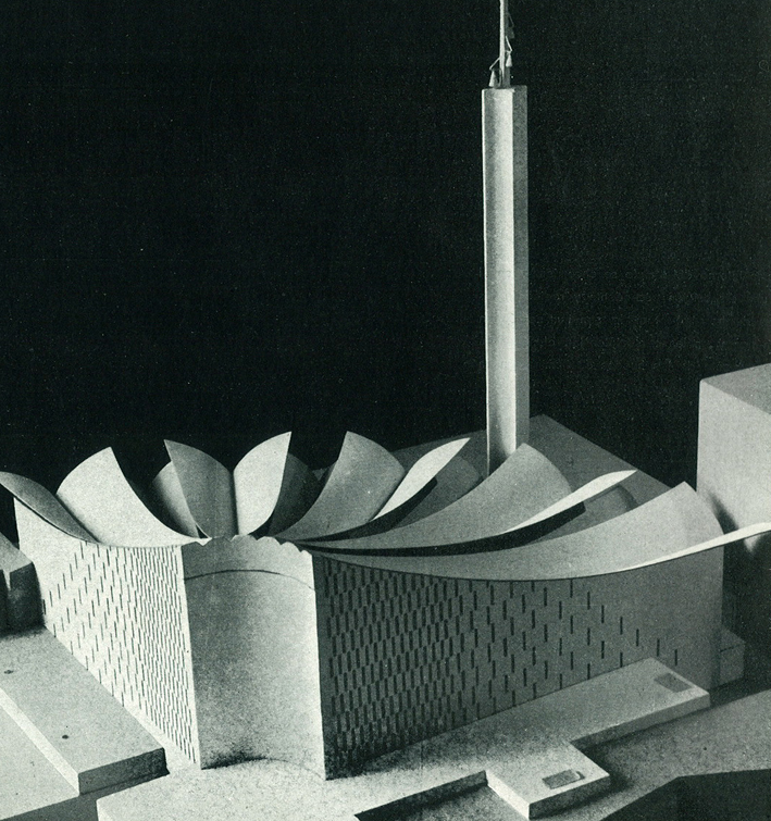 Bajo el lema «Gaviota» proponía un espacio conformado en planta por un sector circular de 90º y una cubierta de conchas autoportantes prefabricadas en hormigón, cuya sección evocaba lejanamente el perfil alado de aquella ave.