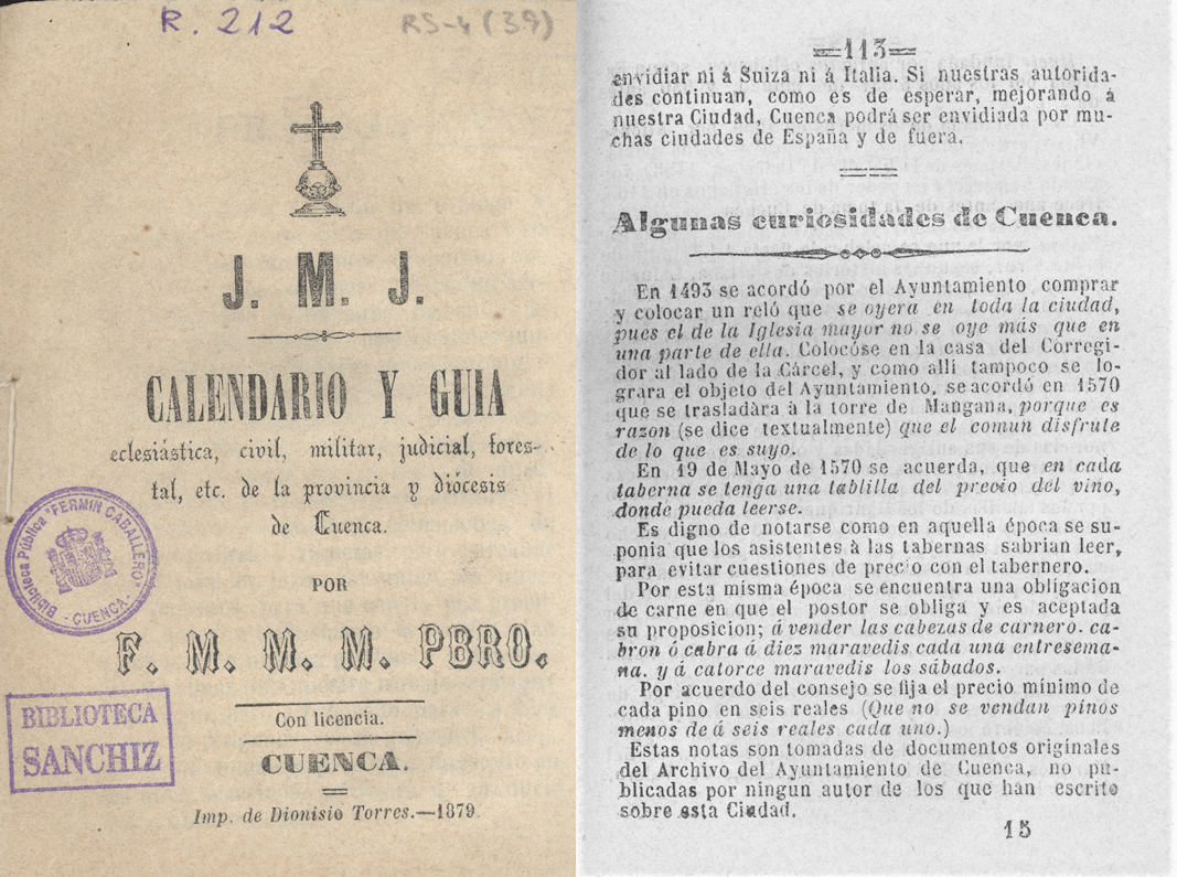 F. M. M. M. (1879) Calendario y guía : eclesiástica, civil, militar, judicial, forestal, etc de la provincia y diócesis de Cuenca. Imprenta de Dionisio Torres (Cuenca)