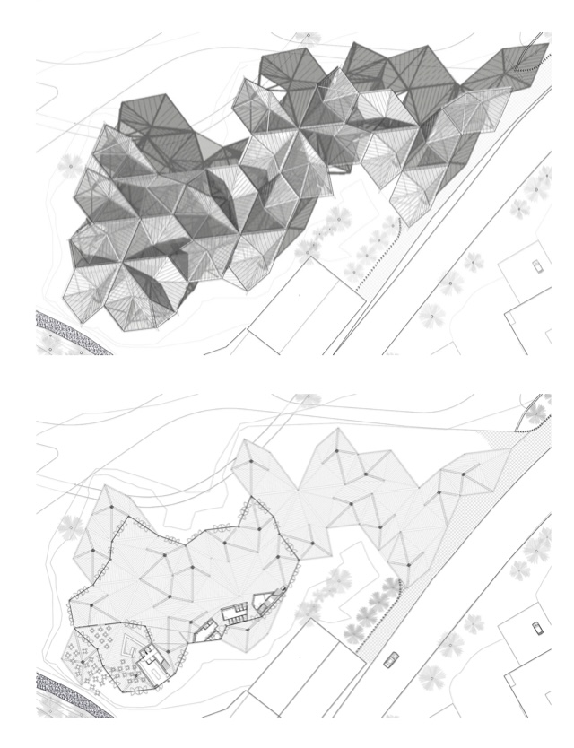 El pabellón se compone de un conjunto de veintitrés módulos iguales e inversos, que juntos forman una malla estructural. Su diseño de forma arbórea es la de un pentágono irregular compuesto de acero y vidrio, con fuste de cuatro brazos. El desarrollo de la forma geométrica final del módulo se basó en la búsqueda del equilibrio entre la repetición de la unidad y la composición de su suma, conjunto donde se quería que la unidad se diluyese, desapareciese. El resultado final se asemeja a un bosque en su interior pero a un fragmento mineral en su exterior. El conjunto ofrece una composición compleja, un bosque de acero capaz de adaptarse a las particularidades de su ubicación. El edificio, aun compuesto por fragmentos, crea en su interior un espacio diáfano, único y continuo.