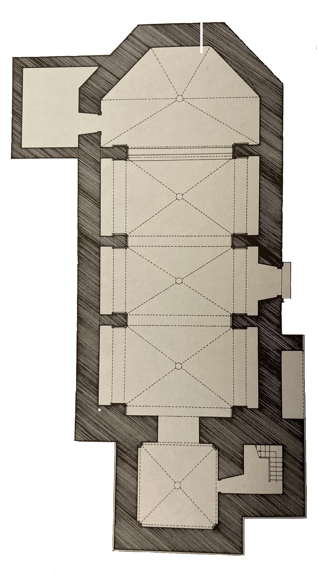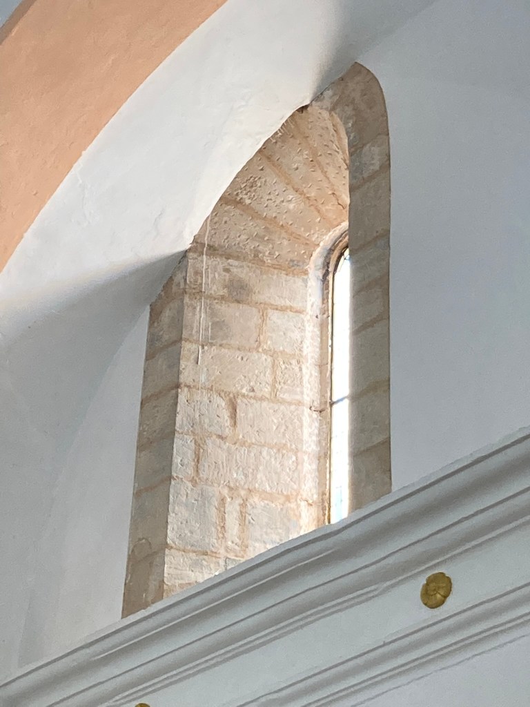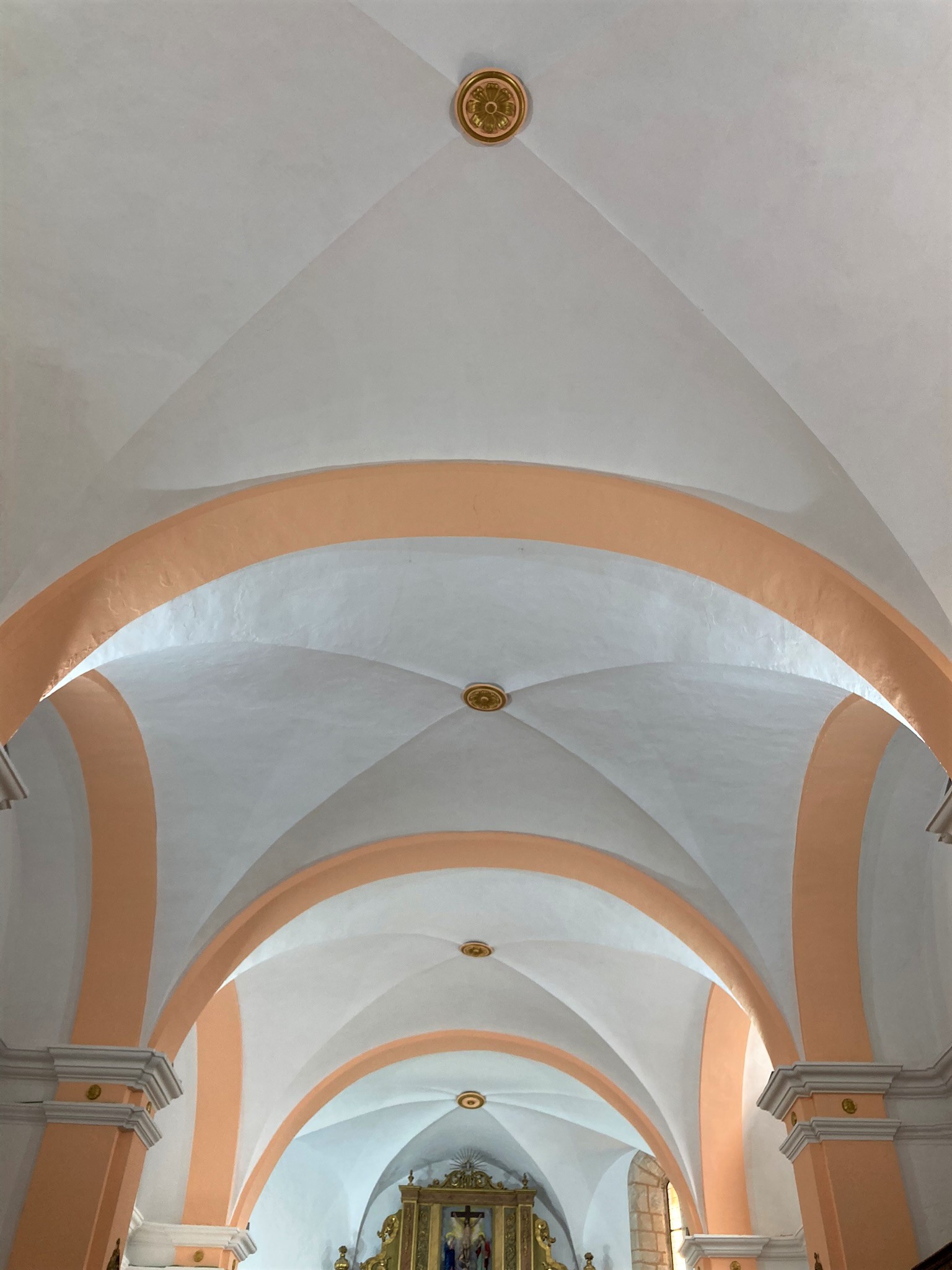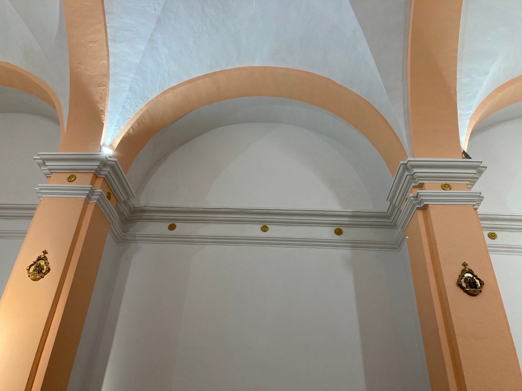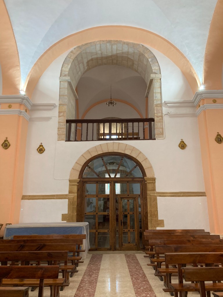 La iglesia está recorrida por un entablamento y a los pies se encuentra en coro.