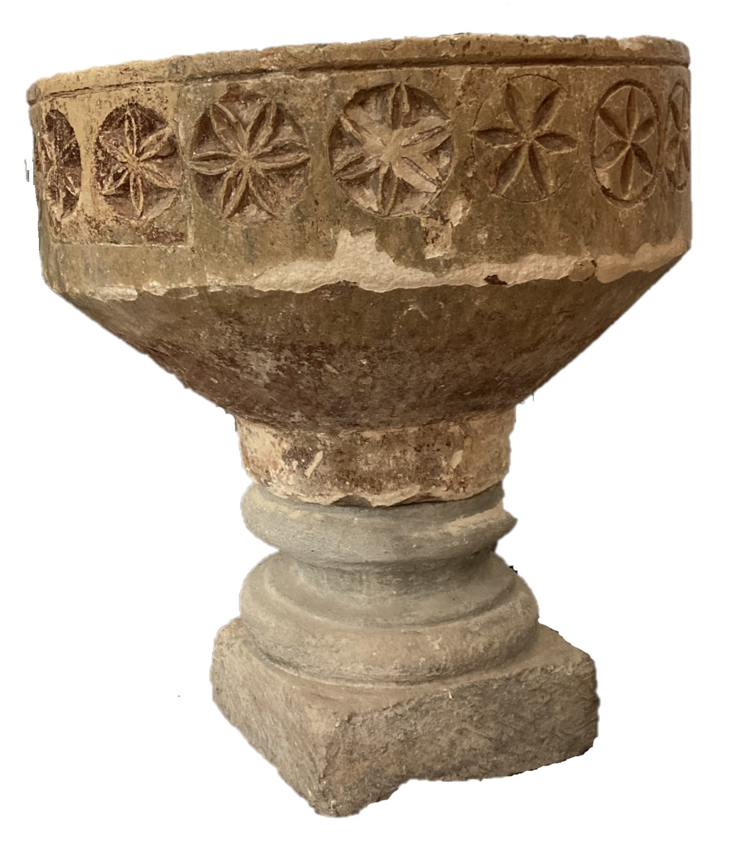 El elemento más antiguo que podemos encontrar es la pila bautismal situada en la parte derecha del altar mayor. De estilo románico, parece ser el recuerdo de la construcción que se hiciera tras la conquista por parte de las tropas cristianas en el s. XII. Su singularidad se encuentra en que la cenefa supera en dimensión al resto del vaso, está decorada con cruces patadas y con estrellas o motivos florales de seis hojas inscritas en un círculo.