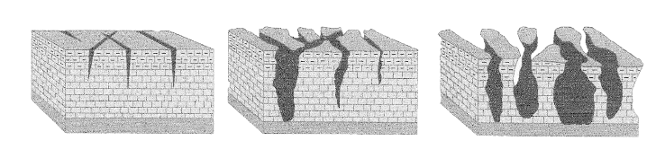 El proceso de formación de un karst carbonatado, empieza con agua cargada de CO2 que se infiltra por las grietas que hay en un terreno carbonatado. Estas aguas ácidas atacan la roca y producen formas erosivas muy diversas que podemos encontrar tanto en superficie como en el subsuelo.