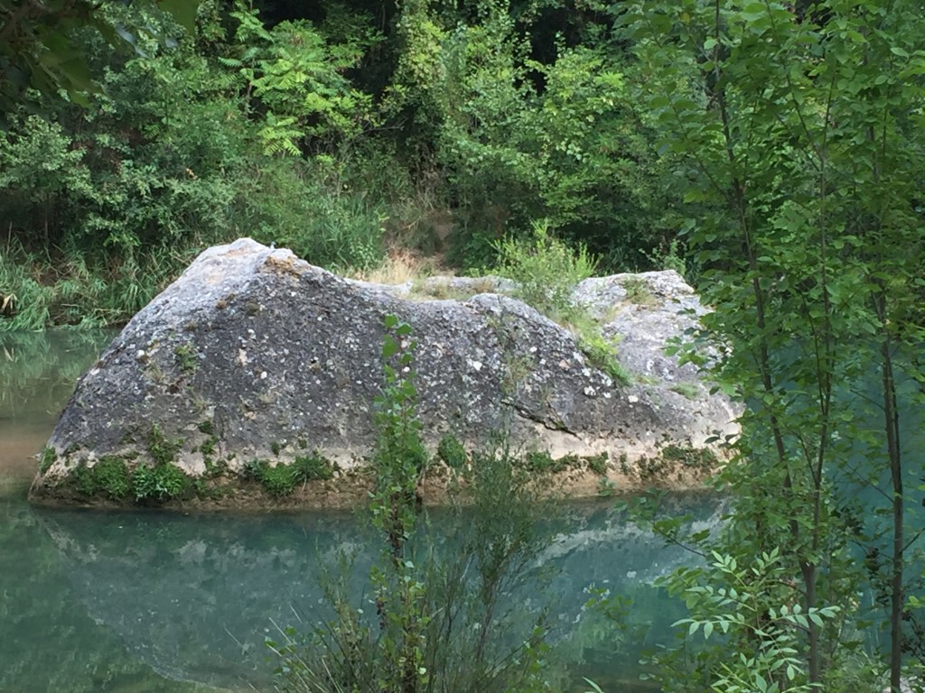 El agua produce desgaste por donde va pasando, produciendo una disolución de arriba a abajo, seguido de la caída por gravedad de los materiales, haciendo que abunden los grandes bloques procedentes de caídas masivas. Algunos de estos grandes desprendimientos se han depositado en el rio formando parte del paisaje fluvial.
