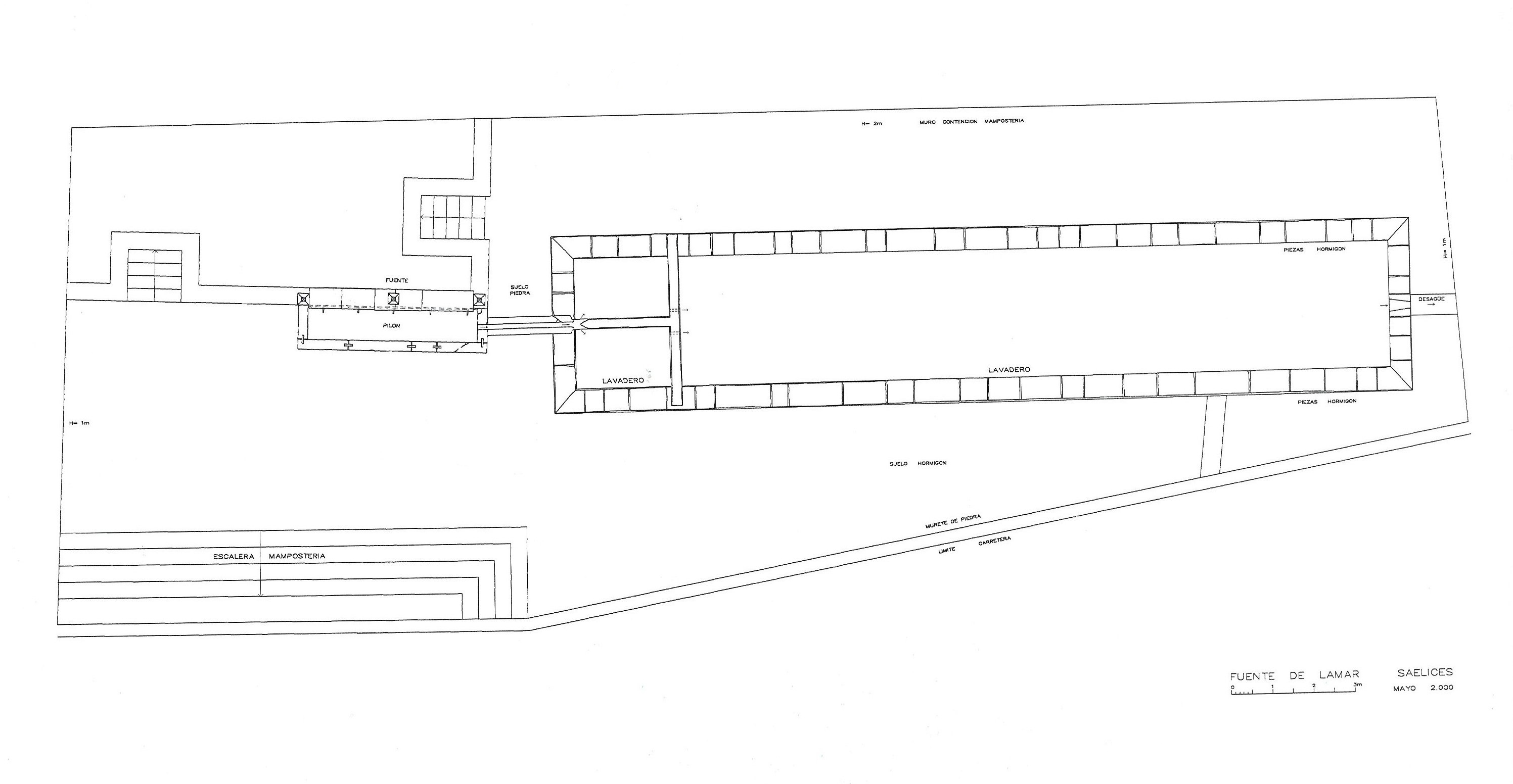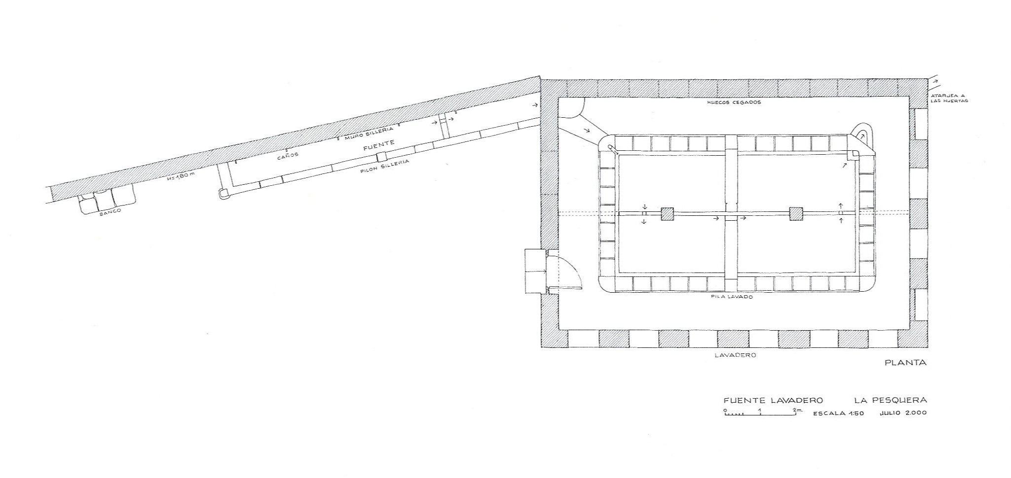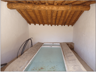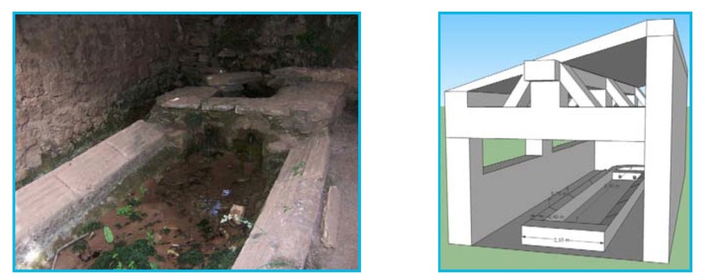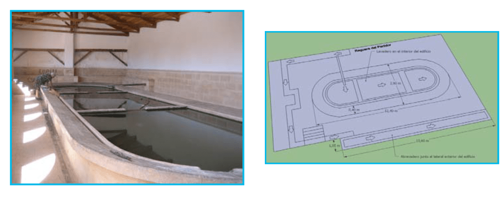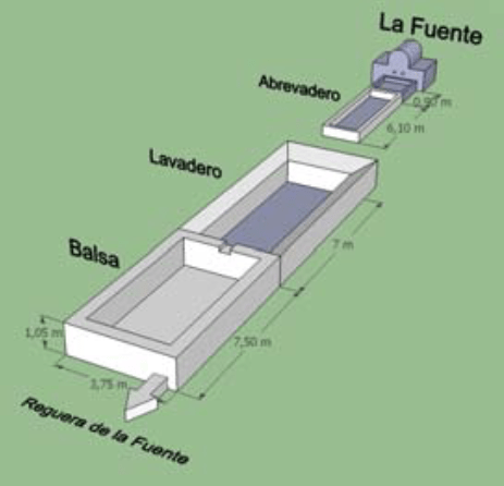 y de un lavadero. El edificio de lavado es rectangular y cuenta, en cada uno de los lados, con 4 losas muy desgastadas por el uso. Se encuentra cubierto por una techumbre a una vertiente.