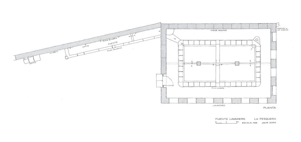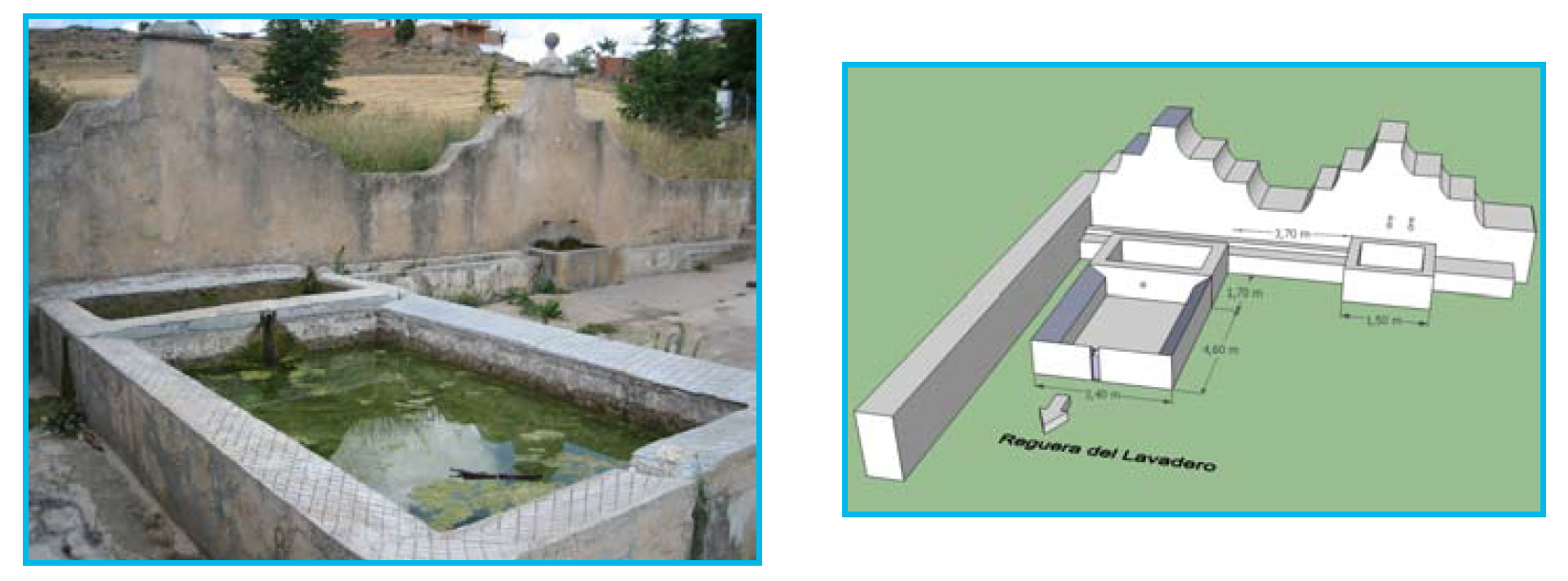 Los lavaderos aparecen muy habitualmente vinculados a las fuentes, aunque tampoco faltan las pequeñas pilas de lavado anejas a los pozos. La solución más elemental es la forma de una poza, conectada al manantial o fuente, fruto de la regularización mediante excavación del terreno natural, donde en sus bordes se colocan losas de piedra, o las propias tablas de lavar. Otra organización pareja es la que se establece aprovechando pequeñas corrientes de agua, bien en pequeños arroyos o regatos naturales, bien en acequias o caces creados artificialmente, tanto para el riego como para abastecer a instalaciones hidráulicas, colocando unas piezas de piedra fijas para el lavado o unos apoyos de piedra o fábrica donde se apoyan las tablas de lavado. Otras soluciones más complejas son las vinculadas a las fuentes donde se crean pilas de lavado, habitualmente de planta rectangular, realizadas en fábrica, donde se disponen las superficies inclinadas de lavado tanto en los cuatro lados de ésta, como en los laterales largos. Sus clásicas superficies inclinadas pueden establecerse, en conexión directa con los propios pilones, alternando soluciones pétreas con fábricas enfoscadas, o separarse ligeramente de la fuente y el pilón para acondicionar una pila de mayor dimensión y comodidad, que se constituía en el espacio de las mujeres.