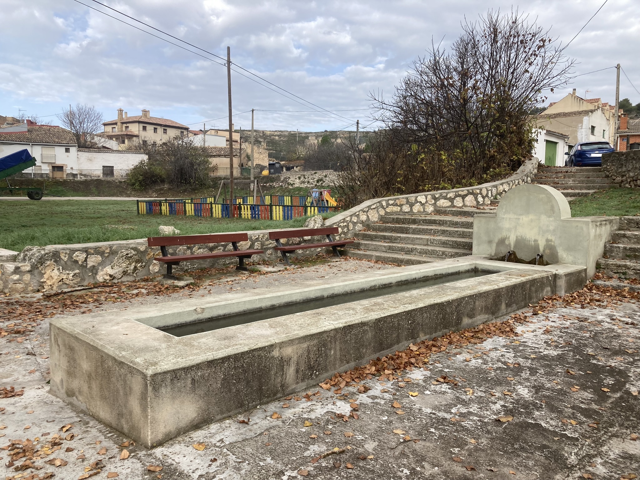 En el otro extremo se dispone una fuente con pilón de factura reciente, cuyas aguas sobrantes sirven a un lavadero, cubierto a un agua, cuyos muros son pórticos constituidos a base de pilastras y arcos rebajados